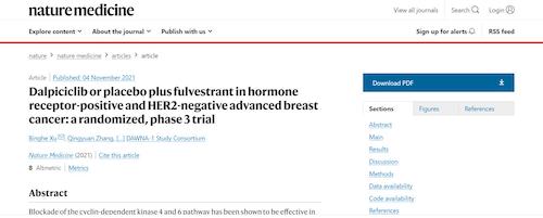 11月4日,国际四大医学期刊之一、英国《自然》旗下《自然医学》(Nature Medicine)在线发表CDK4/6抑制剂达尔西利(SHR6390)联合氟维司群治疗既往内分泌治疗后疾病进展的HR+/HER2-晚期乳腺癌的多中心、随机、双盲III期临床研究(DAWNA-1研究)中期分析结果报告,首次对氟维司群(雌激素受体降解剂)±达尔西利治疗激素受体阳性晚期乳腺癌的有效性和安全性进行了比较。研究结果显示,达尔西利+氟维司群组与安慰剂+氟维司群组相比,无进展生存期(PFS)显著延长。该项研究由中国医学科学院肿瘤医院徐兵河教授担任leading PI,全国39家医院参研,由DB电竞医药临床研发团队支持完成。